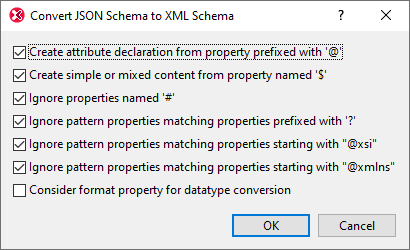When you click the Convert XML Schema to/from JSON Schema command to convert a JSON Schema document (in JSON or YAML format) to an XML schema, the Convert JSON Schema to XML Schema dialog (screenshot below) appears. Set the conversion options you want, and click OK. An XML schema will be generated from the JSON Schema, and the generated document will be opened in a new window.