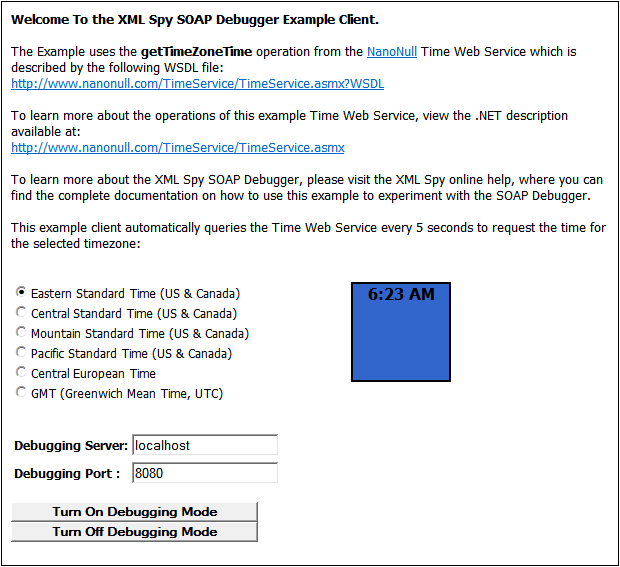The file DebuggerClient.htm will look something like this in the Browser View of XMLSpy. When one of the radio buttons is selected, a SOAP request is sent to the Nanonull Time Web Service. The response from the Web service is displayed in the colored box to the right of the radio buttons.