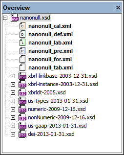 When the concept definitions file (the .xsd file) is open in XBRL View, the various taxonomy files are displayed in a tree structure in the Overview entry helper (as in the screenshot below).