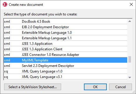 3.After you have finished, select File | Save as to save the file back to the Template folder with a suitable name, say MyXMLTemplate.xml. You now have a document template called MyXMLTemplate, which will appear in the list of document types in the Create New Document dialog.
