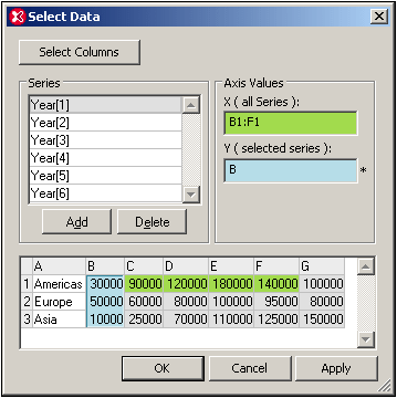 The chart data table can be viewed as a superset of data that is selected using the parameters in the Select Columns dialog. From this superset, you can then select ranges of data you require (in the Axis Values pane) for individual series.