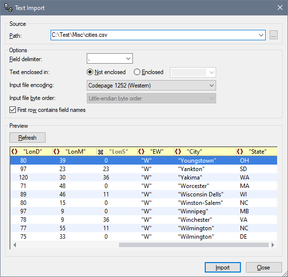To successfully import a text file, you need to specify the field delimiter that is used to separate columns or fields within the file. XMLSpy will auto-detect common row separators (CR, LF, or CR+LF).