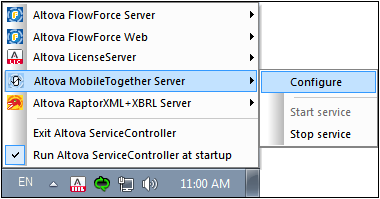 To start MobileTogether Server, click the ServiceController icon in the system tray, hover over Altova MobileTogether Server in the menu that pops up (see screenshot below), and then select Start Service from the MobileTogether Server submenu. If MobileTogether Server is already running, the Start Service option will be disabled.