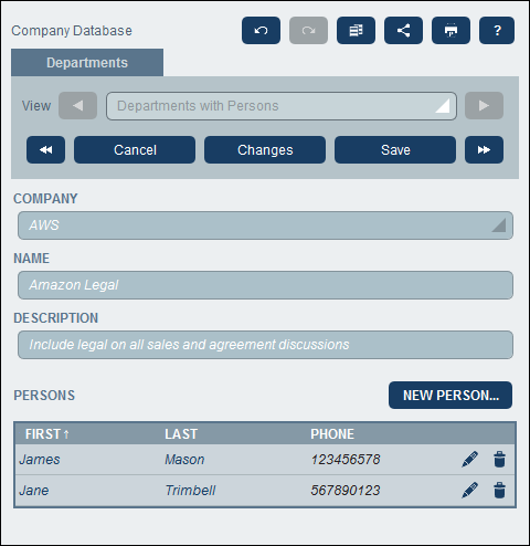 •If your system administrator has enabled the data of related records to be edited, then access to these related records will be available at the bottom of the form. In the screenshot at the start of this topic, for example, the related Person records are shown at the bottom of the form and can be edited. Separate data entry forms for each Person record will be displayed, and you can navigate through the different Person records by clicking the Previous and Next icons at the bottom of the form.