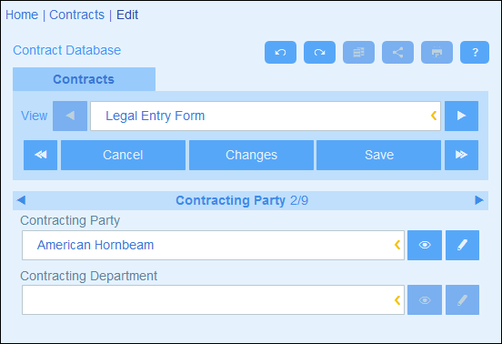 The screenshot below shows the first three sections of a data-entry form, where all sections are on the same page. The first three section names are: (i) Contract Header, (ii) Contracting Party, (iii) Type, Status, Categories, Signee. When the form is initially displayed, the first and third sections are open, while the second is closed. To open/close a section, click the arrow to the left of its name.