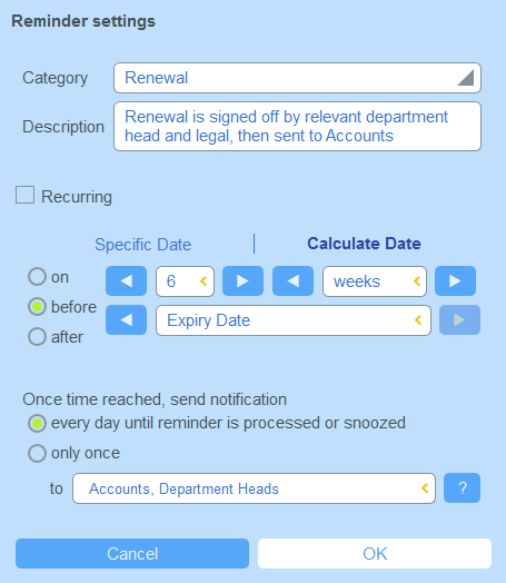 •Reminder start time: There are two alternatives: (i) Select a specific date; or (ii) Calculate a date relative to one of the record's date fields (such as an expiry date). In the screenshot above, for example, the start time has been set to six weeks before the date in the Expiry Date field.
