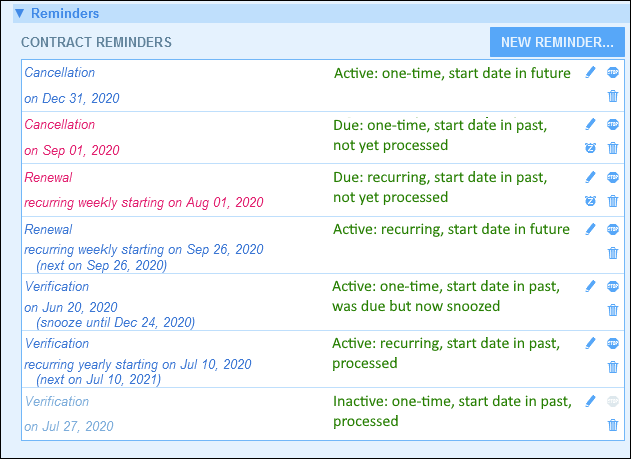 •Active reminder: (i) A one-time reminder that has a start date in the past and which has not been processed; (ii) A recurring reminder that has a start date in the past (and may have been processed); (iii) (i) A reminder (one-time or recurring) that has a start date in the future. (Note: If the action date of an active reminder is in the past and the reminder has not been processed, then the reminder is a due reminder.)