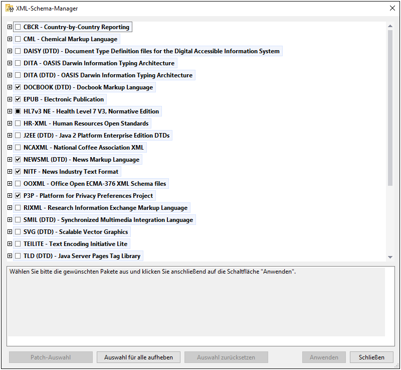 •Anzeigen der auf Ihrem Rechner installierten XML-Schemas und Überprüfung, ob neue Versionen zum Download zur Verfügung stehen.