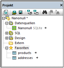 Im Projektfenster wird im Ordner "Favoriten" neben dem Namen des Eintrags ein Pfeil angezeigt. Wenn Sie darauf klicken, wird der Online Browser geöffnet, wobei dieser Favoriteneintrag markiert erscheint. Beachten Sie: Sie können zum Ordner "Favoriten" auch Datenbanken und Schemas oder einzelne Tabellenspalten hinzufügen.