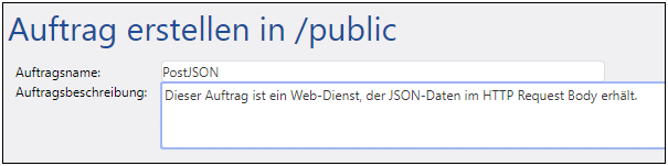 In diesem Beispiel wird ein Fall gezeigt, in dem die Daten im Body des HTTP Request und nicht als Parameter übermittelt werden. Ein Beispiel, in dem ein Web-Dienst mit Parametern aufgerufen wird, finden Sie unter Bereitstellen eines Auftrags als Web-Dienst.