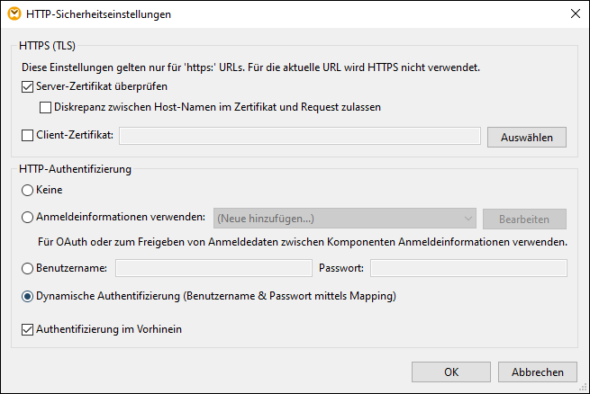 5.Klicken Sie neben "HTTP-Sicherheitseinstellungen" auf die Schaltfläche Bearbeiten und aktivieren Sie das Kontrollkästchen Dynamische Authentifizierung. Dadurch werden die Anmeldeinformationen während der Ausführung des Mappings interaktiv als Input-Parameter für das Mapping bereitgestellt. Informationen zur Option Anmeldeinformationen verwenden finden Sie unter Anmeldeinformationen in Mapping-Funktionen. Die Eingabe des Benutzernamens und Passworts direkt in dieses Dialogfeld wird nur aus Gründen der Rückwärtskompatibilität unterstützt und wird nicht empfohlen.