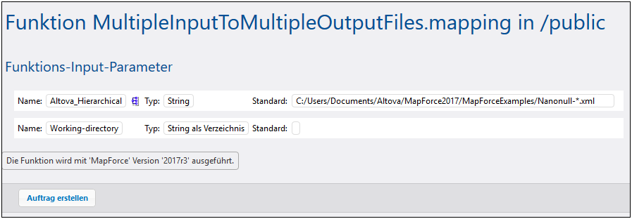 1.Navigieren Sie zum FlowForce Container /public/Examples und klicken Sie auf die zuvor bereitgestellte Funktion MultipleInputToMultipleOutputFiles.mapping. Beachten Sie, dass die Quellkomponente des ganz am Anfang dieses Beispiels beschriebenen MapForce-Mappings nun zu einem Input-Parameter der FlowForce-Funktion geworden ist. Er hat einen Standardwert, nämlich den Pfad zu den vom Mapping verarbeiteten XML-Instanzdateien. Dieser Wert kann später, falls erforderlich, außer Kraft gesetzt werden. Der Parameter "Working-directory" wurde von FlowForce automatisch hinzugefügt; seine Aufgabe wird in den nächsten Schritten erklärt.