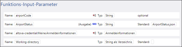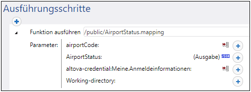 Wenn Sie bei der Erstellung der Anmeldeinformationen die Option Verschlüsselt in MapForce Server-Ausführungsdatei und Mapping-Bereitstellung inkludieren aktiviert haben, werden die zusammen mit dem Mapping bereitgestellten Anmeldeinformationen  im Auftrag verwendet. In diesem Fall müssen Sie diese nicht über die Auftragskonfigurationsseite definieren. So wird z.B. im folgenden Ausführungsschritt die Mapping-Funktion mit den gespeicherten Anmeldeinformationen, falls diese vorhanden sind, ausgeführt (beachten Sie bitte, dass der Parameter "Meine.Anmeldeinformationen" nicht erweitert wurde):