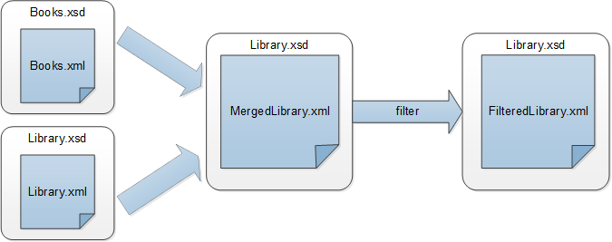 Im obigen Diagramm werden zuerst die Daten aus zwei Quelldateien (Books.xml und Library.xml) in einer einzigen Zieldatei namens MergedLibrary.xml zusammengeführt. Anschließend werden die Daten mit Hilfe einer Filterfunktion transformiert und an die nächste Komponente namens FilteredLibrary.xmlübergeben. Beachten Sie, dass FilteredLibrary.xml auf dem Schema Library.xsd basiert. Die Zwischenkomponente dient sowohl als Datenziel als auch als Datenquelle. Dieses Verfahren wird in MapForce als verkettetes Mapping bezeichnet. Die Zwischenresultate von verketteten Mappings können in einer Vorschau angezeigt und das Zwischenergebnis (in unserem Fall MergedLibrary.xml) und das Ergebnis der letzten Zielkomponente (in unserem Fall FilteredLibrary.xml) können gespeichert werden.