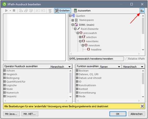 •In XPath-Ausdrücken können Java- und .NET-Erweiterungsfunktionen verwendet werden, wodurch Sie Zugriff auf die Funktionen dieser Programmiersprachen erhalten. Über die Schaltflächen Java und .NET am unteren Rand des Dialogfelds können Sie Info-Felder mit Erklärungen zur Verwendung von Java- und .NET-Erweiterungsfunktionen in XPath-Ausdrücken aufrufen. Nähere Informationen dazu finden Sie in dieser Dokumentation im Abschnitt Erweiterungsfunktionen.