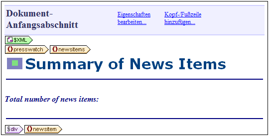 Automatische Berechnungen sind eine effiziente Methode, um anhand der verfügbaren XML-Daten zusätzliche Informationen bereitzustellen. In diesem Abschnitt werden zwei Informationen zum Design hinzugefügt: die Gesamtzahl der Nachrichten (news items) und der Zeitraum, den diese Nachrichtenmeldungen im XML-Dokument abdecken. Keine dieser Informationen ist im XML-Dokument direkt verfügbar, sondern beide Informationen müssen anhand der verfügbaren Daten errechnet werden.