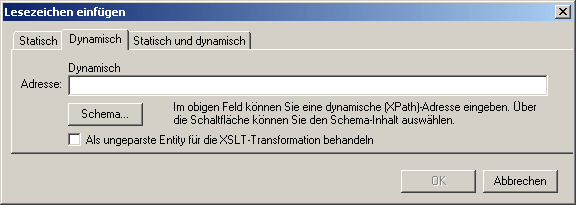 3.Wählen Sie im Dialogfeld "Lesezeichen einfügen" (Abbildung unten) ein Register aus, je nachdem ob Sie einen statischen (Register "Statisch"), einen anhand des XML-Dokuments erstellten dynamischen (Register "Dynamisch") oder einen nach Belieben durch einen XPath-Ausdruck generierten Namen oder einen aus statischen und dynamischen Komponenten zusammengesetzten Namen ("Statisch und dynamisch") einfügen möchten. In der Abbildung unten wird ein dynamisches Lesezeichen erstellt, das als Namen eine eindeutige ID für jedes Name Child-Element des Kontextnode hat.