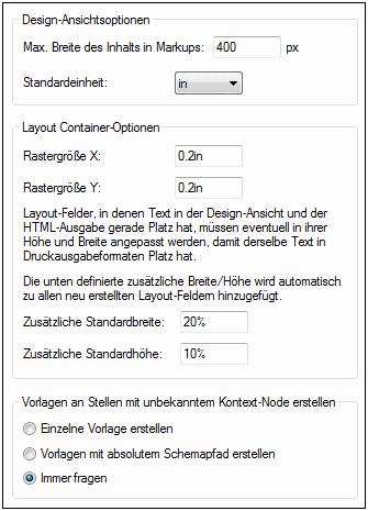 •Zusätzliche Standardbreite und Höhe von Layout-Feldern. Diese zusätzlichen Höhen- und Breitenangaben werden zu allen Layout-Felder hinzugefügt, damit größer dargestellter Text in Druckformaten Platz hat. Diese Werte können als Prozentwerte oder in Form von absoluten Längeneinheiten definiert werden.
