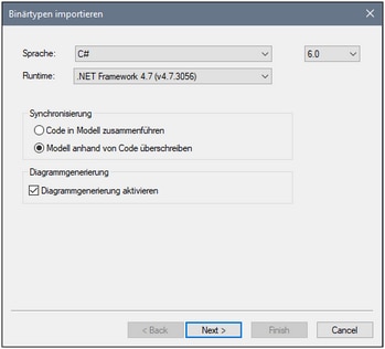 6.Um anhand der importierten Binärtypen optional Klassen- und Paketdiagramme zu generieren, aktivieren Sie das Kontrollkästchen Diagrammgenerierung aktivieren. Wenn Sie diese Option auswählen, stehen in den nächsten Schritten weitere Diagrammgenerierungsoptionen zur Verfügung. Siehe auch Generieren von Klassendiagrammen und Generieren von Paketdiagrammen.