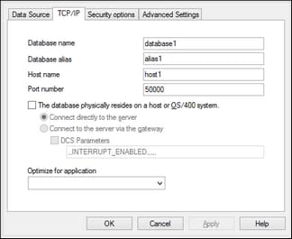 7.Geben Sie auf dem Register TCP/IP den Datenbanknamen, einen Namen für den Alias, den Host-Namen und die Port-Nummer ein und klicken Sie auf OK.