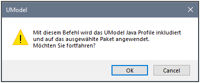 Über den Menübefehl Projekt | Unterprojekt inkludieren können Sie jedes der vordefinierten Profile zu Ihrem Projekt hinzufügen. Außerdem werden Sie, immer, wenn Sie eine Aktion durchführen, für die ein bestimmtes Profil benötigt wird, von UModel aufgefordert, ein vordefiniertes Profil anzuwenden. Wenn Sie z.B. mit der rechten Maustaste auf ein neues Paket klicken und im Kontextmenü die Option Code Engineering | Als Java Namespace Root definieren auswählen, werden Sie aufgefordert, das Java-Profil darauf anzuwenden.