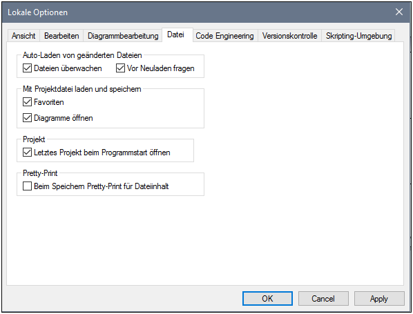 ob das zuletzt geöffnete Projekt beim Starten der Applikation automatisch geöffnet werden soll.
