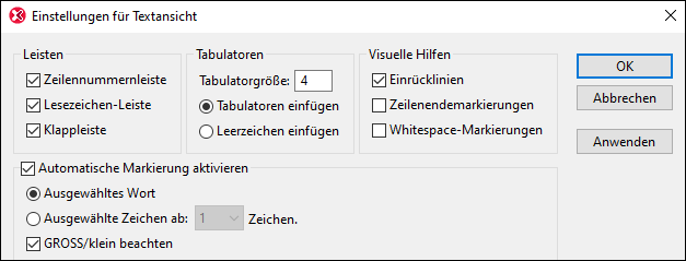 Um die Textmarkierungsfunktion zu aktivieren, aktivieren Sie im Dialogfeld "Einstellungen für Textansicht" (Ansicht | Einstellungen für Textansicht, Abbildung unten) das Kontrollkästchen Automatische Markierung aktivieren. Als Auswahl kann ein ganzes Wort oder eine festgelegte Anzahl von Zeichen definiert werden. Sie können außerdem definieren, ob die Groß- und Kleinschreibung berücksichtigt werden soll.
