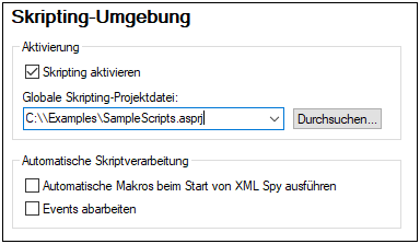 Um ein globales Skripting-Projekt für XMLSpy zu definieren, aktivieren Sie das Kontrollkästchen Skripting aktivieren und suchen Sie die gewünschte Altova Skripting-Projektdatei (.asprj-Datei). Außerdem können Sie folgende Einstellungen definieren: (i) ob automatische Makros im Skripting-Projekt beim Start von XMLSpy automatisch ausgeführt werden sollen und (ii) ob Application Event Handler-Skripts im Projekt automatisch ausgeführt werden sollen oder nicht; aktivieren bzw. deaktivieren Sie das entsprechende Kontrollkästchen.