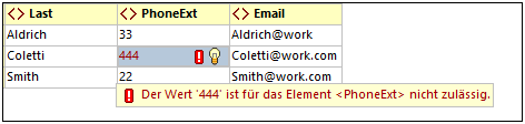 Beachten Sie jedoch, dass PhoneExt, wie im Schema definiert, eine Ganzzahl zwischen 0 und 99 sein muss, damit die Datei gültig ist. Sie können die XMLSpy-Funktion zur Validierung während der Bearbeitung aktivieren. Wenn diese Funktion aktiv ist, wird die Datei, jedes Mal, wenn der Fokus auf einen neuen Node verschoben wird, validiert. Testen Sie die dynamische Valdierung folgendermaßen: