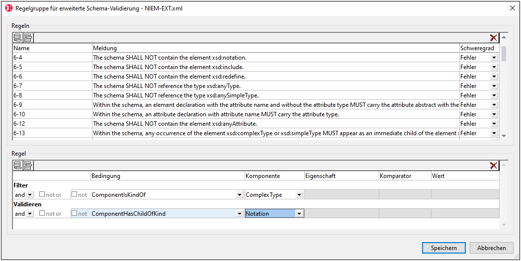 Um eine Regel zu definieren oder zu bearbeiten, wählen Sie die Regel in der Liste im oberen Bereich "Regeln" aus. Die Definition der Regel wird im Bereich "Regel" angezeigt, wo sie auch bearbeitet werden kann. In der Abbildung unten sehen Sie eine Regel, die folgendermaßen definiert werden kann: Wenn ein complexType eine Erweiterung eines simpleType ist, muss er ein Child der Art AttributeGroup haben.