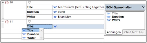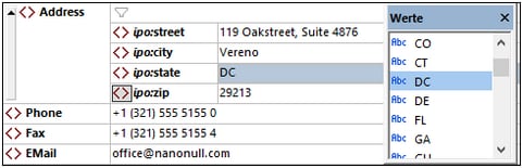 Bei der Autokomplettierung werden Ihnen an der Cursorposition Eingabeoptionen vorgeschlagen (siehe Abbildung unten). Diese auf den Definitionen im Schema basierenden Optionen werden (i) über Popups im Hauptfenster und (ii) über die Eingabehilfen vorgeschlagen. In den Pop-ups und Eingabehilfen wird jeweils eine Liste von Einträgen angezeigt, die an dieser Cursorposition gültig sind. Mit Hilfe der Pfeiltasten können Sie durch die Einträge in der Pop-up-Liste navigieren. Wählen Sie einen Eintrag aus dem Pop-up-Fenster aus oder doppelklicken Sie in der Eingabehilfe auf einen Eintrag, um diesen einzufügen.