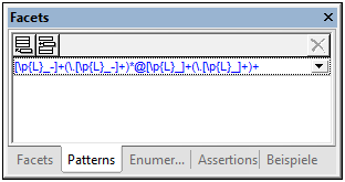 Fügen Sie durch Klicken auf das Anhängen- oder Einfügen-Symbol links oben ein pattern Facet hinzu und geben Sie anschließend eine Regular Expression zur Definition des gewünschten Patterns ein. Um ein pattern zu löschen, wählen Sie es aus und klicken Sie auf das Löschen-Symbol in der rechten oberen Ecke.
