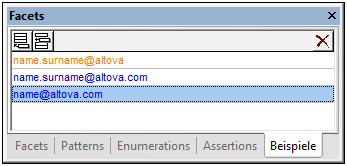 Auf dem Register "Beispiele" (Abbildung unten) können Sie Beispielwerte definieren, die bei der Generierung einer XML-Datei anhand des XML-Schemas (Menübefehl DTD/Schema | XML-Beispieldatei erzeugen) verwendet werden können. Wenn ein Beispielwert ungültig ist, wird der Beispielwert zur Warnung orange angezeigt. Der erste Wert in der Abbildung unten ist ungültig, weil er nicht mit dem für E-Mails definierten pattern Facet übereinstimmt (siehe Register Patterns oben).