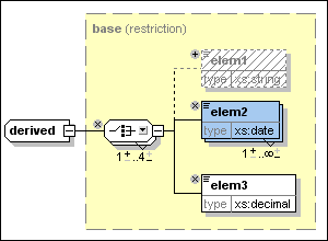 Mit Hilfe von Smart Restrictions werden die beiden Content Models in der grafischen Ansicht des abgeleiteten Content Model kombiniert und in Zusammenhang gesetzt. Im abgeleiteten ComplexType sehen Sie alle Partikel des Basis-complexType und in welcher Beziehung sie zum abgeleiteten Typ stehen. Außerdem bieten Smart Restrictions visuelle Anhaltspunkte und zeigen alle Möglichkeiten, wie der Basistyp mittels Restriction eingeschränkt werden kann, wodurch es einfacher wird, den abgeleiteten Typ korrekt einzuschränken.