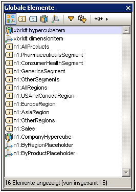 In der Eingabehilfe "Globale Elemente" (Abbildung unten) werden alle Items, Tuples, Hypercubes und Dimensions eines Taxonomiedokuments angezeigt. Elemente können aus der Eingabehilfe "Globale Elemente" in das Hauptfenster gezogen werden.