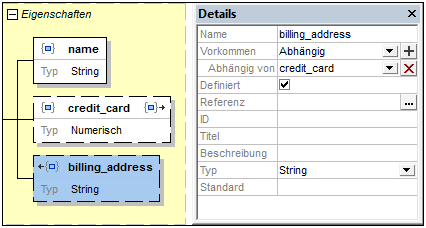 Anmerkung: In den Kästen der beiden an der Abhängigkeit beteiligten Eigenschaften wird ein Symbol angezeigt (siehe Abbildung oben). Wenn Sie auf das Symbol der einen Eigenschaft klicken, gelangen Sie zur anderen Eigenschaft.