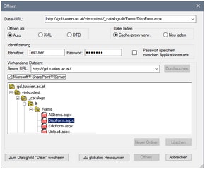 Es gibt mehrere Dialogfelder zum Öffnen und Speichern von Dateien, über die Sie die gewünschte Datei entweder über eine URL oder eine globale Ressource (siehe Abbildung unten) auswählen bzw. speichern können. Wählen Sie den Befehl Zu URL wechseln oder Globale Ressourcen, um das entsprechende Dialogfeld aufzurufen.