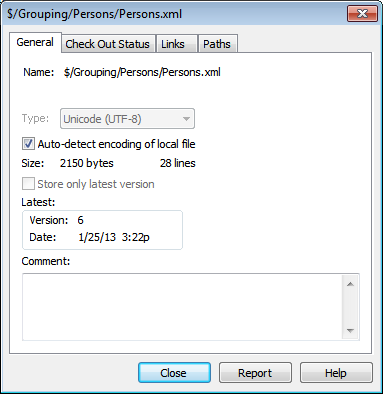 Mit dem Befehl Eigenschaften anzeigen werden die Eigenschaften der gerade ausgewählten Datei angezeigt (Abbildung unten). Welche Eigenschaften angezeigt werden, hängt vom verwendeten Versionskontrollsystem ab. In der Abbildung unten sehen Sie die von Visual SourceSafe angezeigten Eigenschaften.