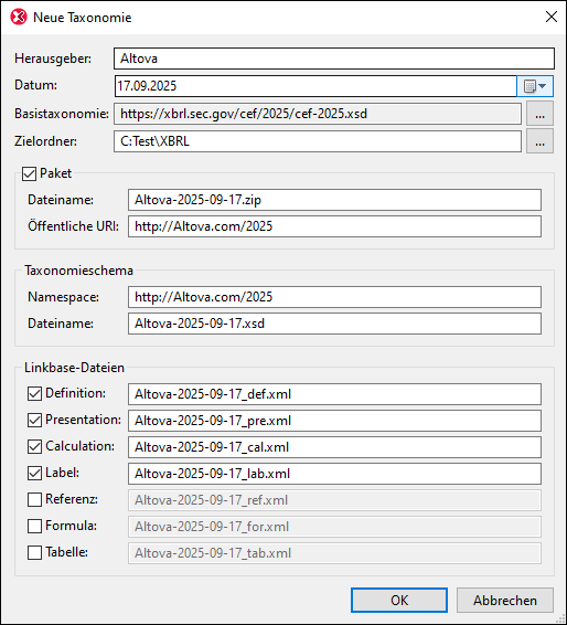 Mit diesem Befehl wird eine neue Taxonomie in dem von Ihnen angegebenen Zielordner erstellt. Sie können die neue Taxonomie direkt im Zielordner als Sammlung von Taxonomiedateien oder als Taxonomiepaket in diesem Ordner erstellen. Bei Aufruf des Befehls wird das Dialogfeld "Neue Taxonomie" (Abbildung unten) angezeigt. Klicken Sie nach Eingabe der Eigenschaften der neuen Taxonomie auf OK und die neue Taxonomie wird erstellt.