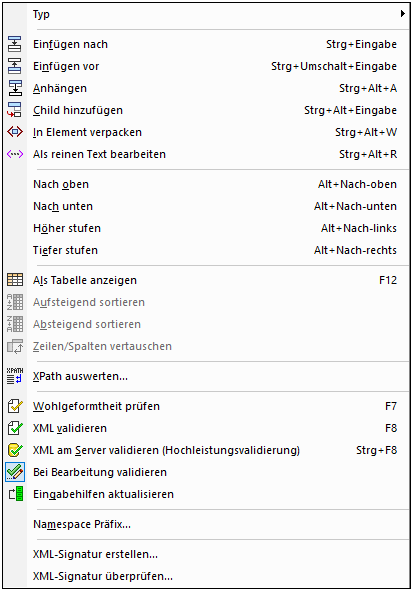 Zu den am häufigsten verwendeten XML-Aufgaben zählen die Überprüfung von Dokumenten auf ihre Wohlgeformtheit und Gültigkeit. Sie finden diese Befehle in diesem Menü.