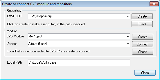 In der Abbildung oben entspricht der lokale Pfad dem lokalen Arbeitsbereichordner, der dem CVS-Modul MyProject entspricht und an diesen gebunden ist.