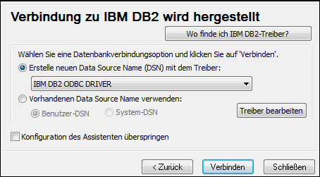 4.Wählen Sie den gewünschten IBM DB2-Treiber aus der Liste aus und klicken Sie anschließend auf Verbinden. (Um die Liste der verfügbare Treiber zu bearbeiten, klicken Sie auf Treiber bearbeiten und aktivieren bzw. deaktivieren Sie anschließend die IBM DB2-Treiber, die Sie hinzufügen bzw. entfernen möchten.)