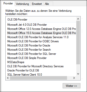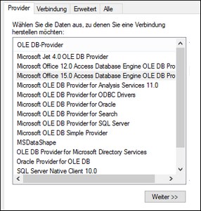 3.Gehen Sie im daraufhin angezeigten Dialogfeld (Abbildung unten) zum Register Provider, wählen Sie Microsoft Office 15.0 Access Database Engine OLE DB Provider und klicken Sie anschließend auf Weiter.