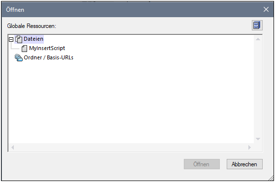 5.Wählen Sie die zuvor erstellte Ressource "MyInsertScript" aus und klicken Sie auf Öffnen.