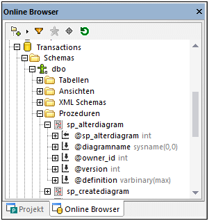 Wenn die aktuell verbundene Datenbank gespeicherte Prozeduren unterstützt und enthält, werden diese standardmäßig im Ordner "Prozeduren" des Online Browsers angezeigt.
