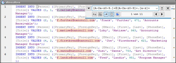 Sie können zum Suchen eines Text-String Regular Expressions verwenden. Aktivieren Sie dazu zuerst die Option Regular Expression (siehe Tabelle oben). Geben Sie anschließend die Regular Expression in das Suchfeld ein. Bei Klick auf _ic_find_regex_builder (Regular Expression Builder) erhalten Sie eine Liste von Beispielausdrücken für Regular Expressions (siehe unten). In der Abbildung unten sehen Sie eine Regular Expression zum Suchen von E-Mail-Adressen.