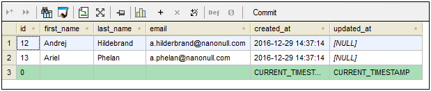 In den SQL Editor-Optionen können Sie festlegen, dass die entsprechenden Standardwerte der einzelnen Spalten in neue Zeilen eingefügt werden. Im Beispiel oben ist nur in den Spalten created_at und updated_at ein Standardwert definiert; DatabaseSpy fügt diese Spalten daher automatisch. Wenn die Standardeigenschaft nicht entsprechend definiert wurde, wird eine leere Zeile in das Ergebnisraster eingefügt.