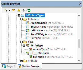 Außerdem wird im Online Browser der Name des eindeutigen Schlüssel-Constraints im Ordner "Schlüssel" der jeweiligen Tabelle angezeigt und mit dem Symbol für eindeutige Schlüssel dbs_ic_unique_key gekennzeichnet. Das einzig mögliche Child eines eindeutigen Schlüssels ist die Spalte dbs_ic_column_unique, in der der Schlüssel definiert ist.