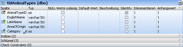 Wenn Sie in einem Tabellendesign mit der rechten Maustaste in die Kopfzeile des Abschnitts "Spalten" klicken, können Sie eine Reihe zusätzlicher Eigenschaften (Standardwert, Beschreibung, Identity, Inkrementieren und Anfangswert) zur Anzeige im Design auswählen. Aktivieren Sie im Kontextmenü die Eigenschaften, die Sie anzeigen möchten oder wählen Sie die Option Alle zusätzlichen Spalten anzeigen.