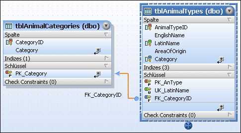 Die gleiche Beziehung, jedoch aus der Sicht der referenzierenden Tabelle tblAnimalTypes gesehen, wird mit einer orangen Beziehungslinie dargestellt.